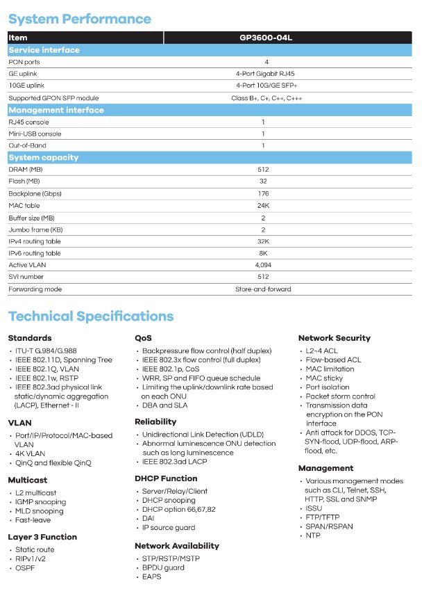BDCOM GP3600-04L-2AC is equipped with 4x Gpon ports, 4x GE RJ45 ports, 4x 10GE SFP+ ports, 1x console port and 1x out-band port. Supports asymmetric uplink 1.25 GBPS and Downlink 2.5 GBPS PON Transfer speed. In addition, it has a built-in dual-AC power.More information