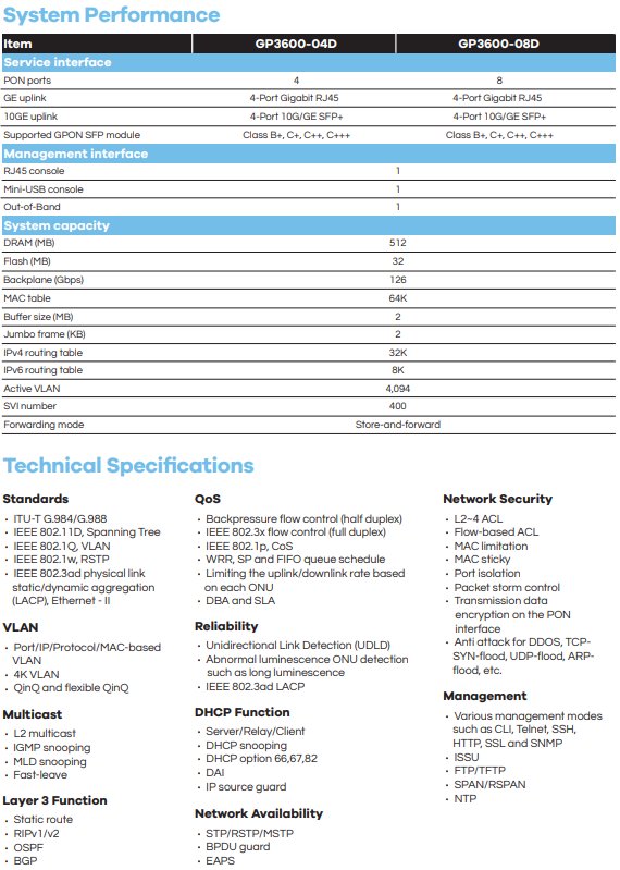 BDCOM GP3600-08D-AR je vybaveno 8x GPON porty, 4x GE RJ45 porty, 4x 10GE SFP+ porty, 1x konzolovým portem a 1x out-band portem. Podporuje asymetrický uplink 1.25 Gbps a downlink 2.5 Gbps PON přenosovou rychlost. Navíc má DC napájení (13.8 V / 2.5 A).Další informace