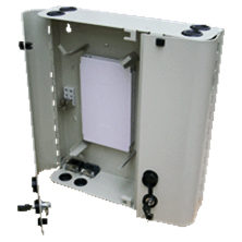 Wall optical switchboard 24XST, metal-switchboard for 24 hundred couplings is used to end max. 24 fibers. The metal switchboard has a lockable two-piece door. It also has 4 upper and 6 lower cable inputs.